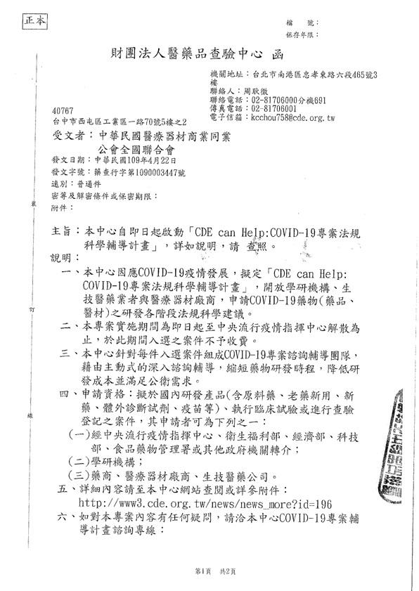 ◎財團法人醫藥品查驗中心自即日起啟動「CDE can Help: COVID-19專案法規科學輔導計劃」,詳如說明,請查照。