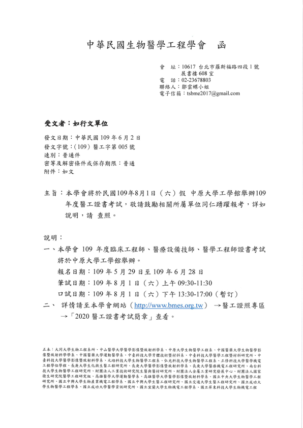 ◎中華民國生物醫學工程學會將於民國109年8月1日(六) 假中原大學工學館舉辦109年度醫工證書考試,敬請鼓勵相關所屬單位同仁踴躍報考,詳如說明,請查照。