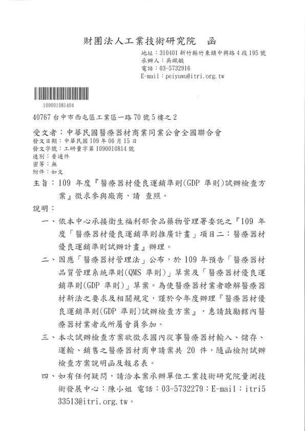 ◎109年度「醫療器材優良運銷準則(GDP準則)試辦檢查方案」徵求參與廠商,請查照。