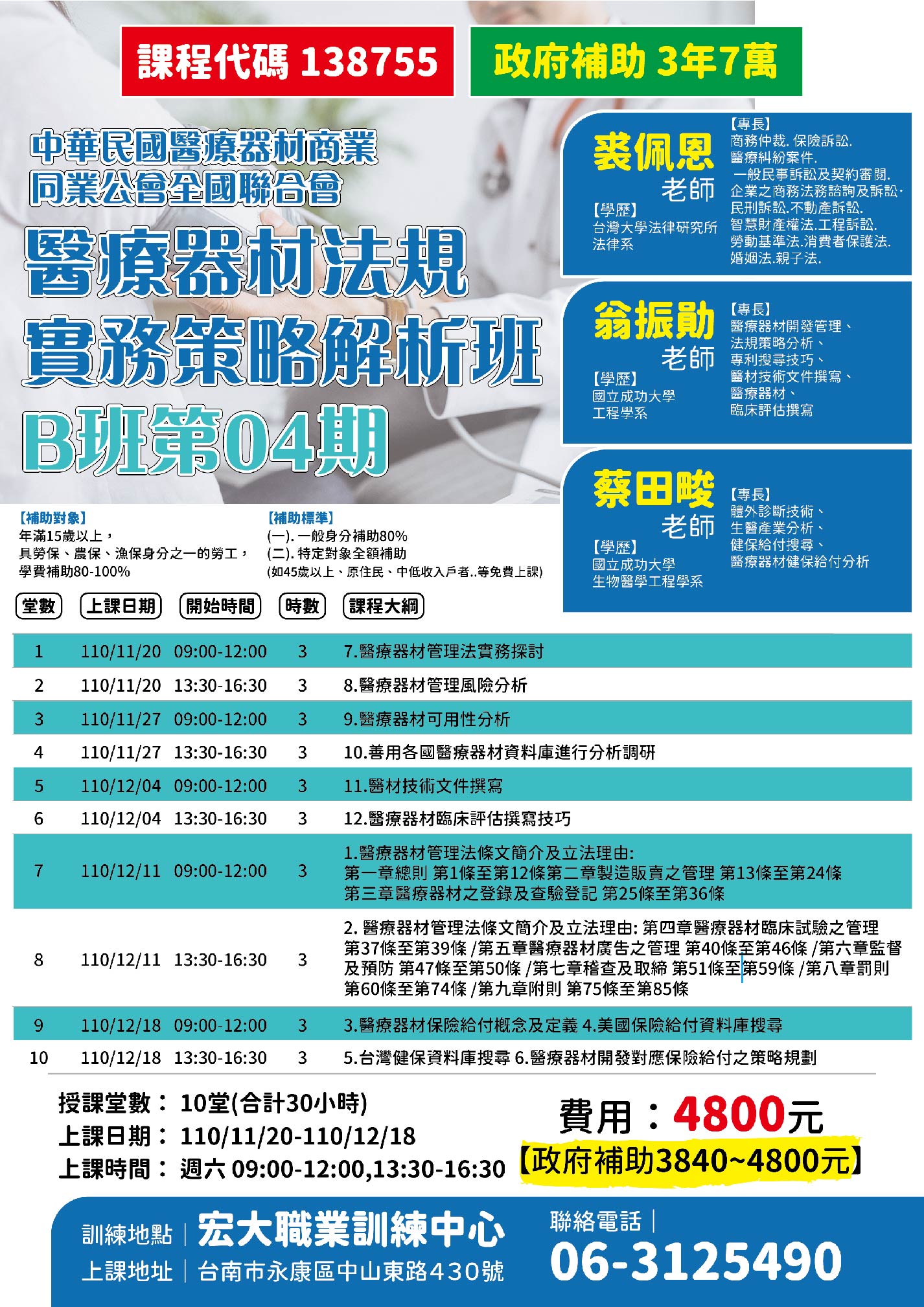 台南「醫療器材法規實務策略解析B班第04期」課程代碼:138755