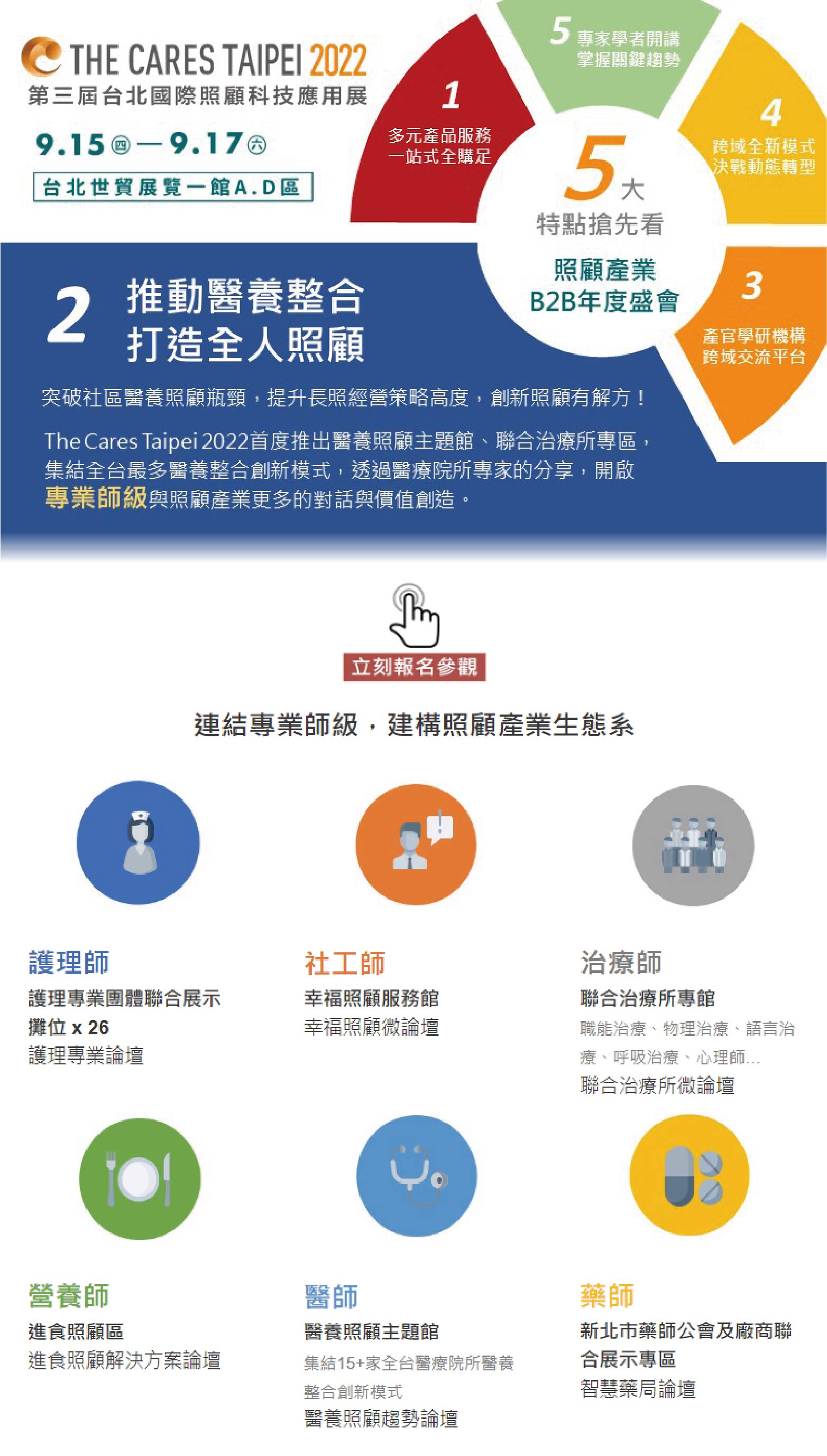 ◎【111/07/19公告】The Cares Taipei 2022 第三屆台北國際照顧科技應用展 時間: 2022/9/15-17