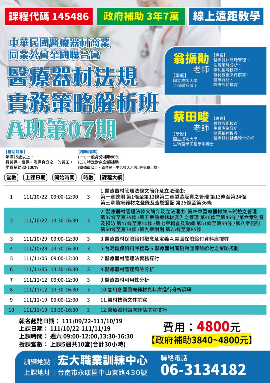 ◎【111/08/22公告】「醫療器材法規實務策略解析A班第07期」課程代碼:145486 訓練起迄日期:111/10/22~ 111/11/19