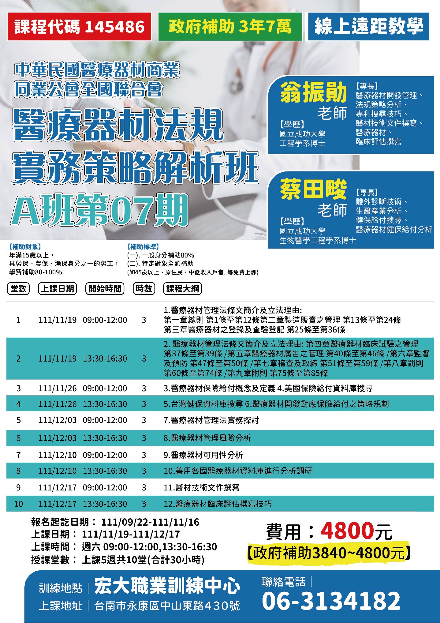 ◎【111/10/20公告】「醫療器材法規實務策略解析A班第07期」課程代碼:145486 訓練起迄日期:111/11/19~ 111/12/17
