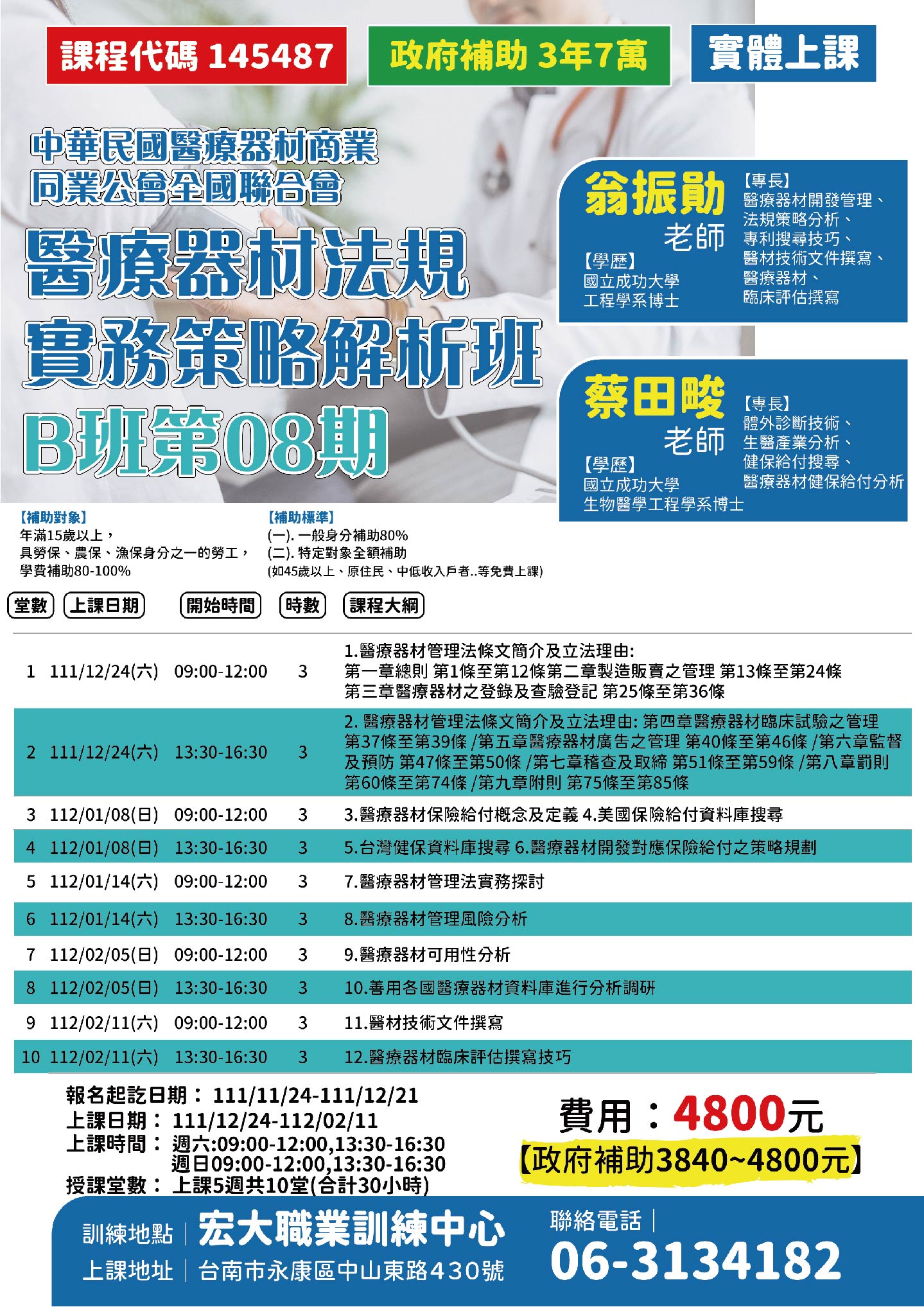◎【111/10/20公告】「醫療器材法規實務策略解析B班第08期」課程代碼:145487 訓練起迄日期:111/12/24~ 112/2/11